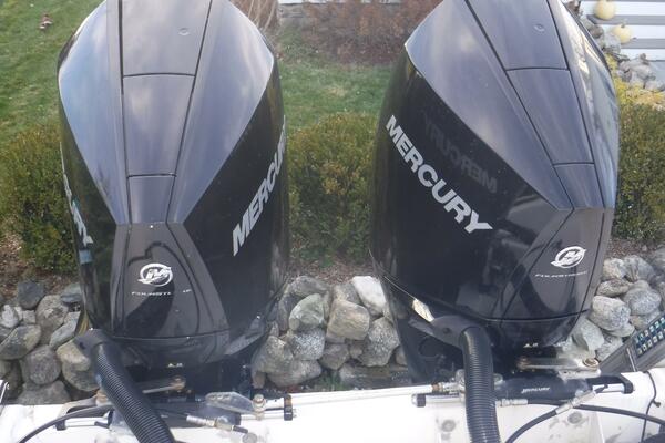 Great Fishing Boat, 2021 Twin Mercury Verado 250hp Outboards, stainless props and Mercury Smartcraft Gauges. Boat Cruises 25-27 MPH, WOT 35. Very roomy layout, Head and bunk below in center console, Fish Boxes, huge Livewell, Outriggers, Raymarine electronic;s, GPS, Chartplotter, Fishfinder, Electr